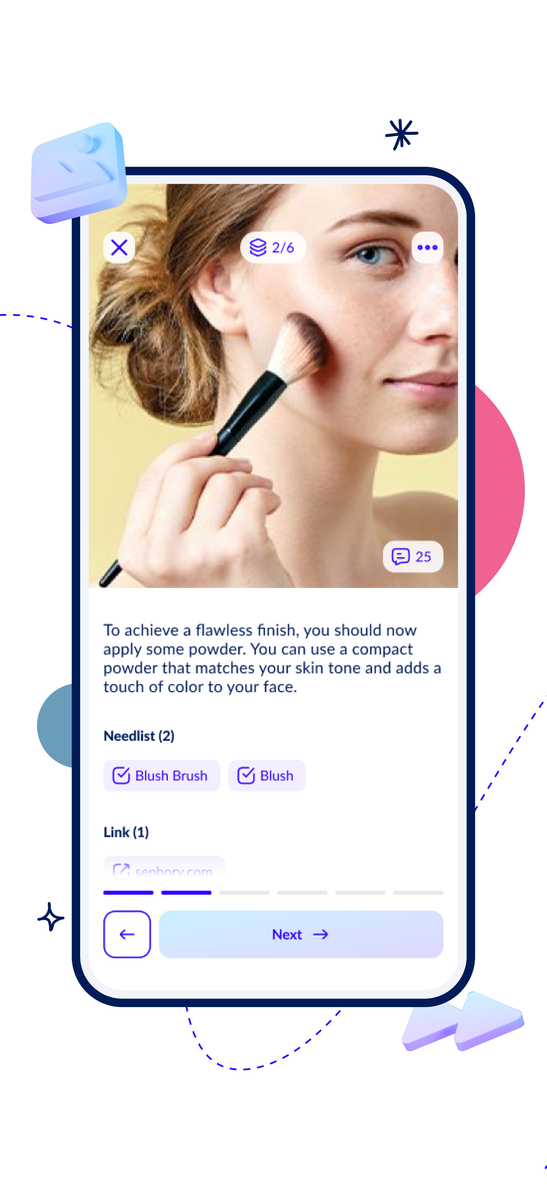 Follow content step by step. Each step features text, images, audio, or videos on loop, along with all the necessary items, links, and documents. Ask the creator or community for help anytime.